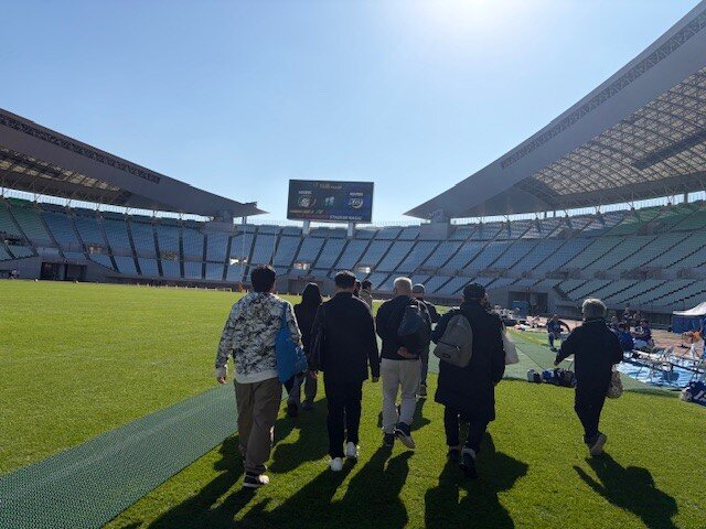 すぐ近くでは試合を控えた選手たちがウォーミングアップを行っており、熱気にあふれる中、フィールド一面に広がる天然芝の感触を確かめるように踏みしめるytvアンバサダーの皆さん。