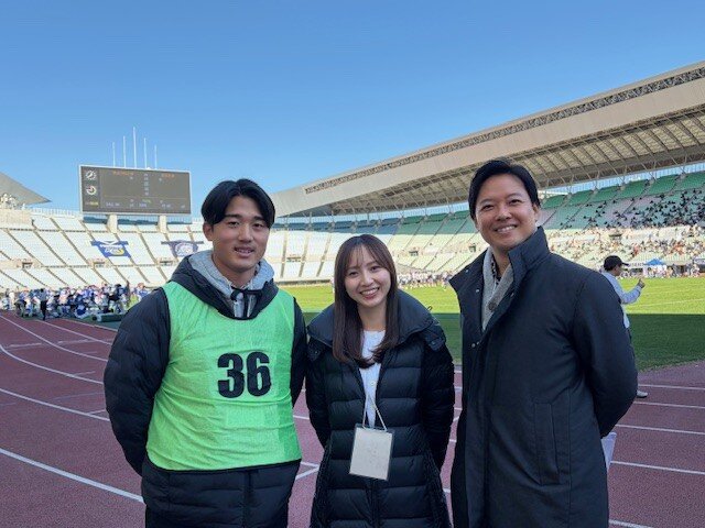 すると、フィールドに12月14日(日)に読売テレビで中継する『甲子園ボウル』で、実況を務める立田恭三アナウンサー、『甲子園ボウル』の中継ディレクターである小田賀ディレクター、そして関西アメフトのハイライトをお届けする『タッチダウンフリーク』のMCを務める吉澤真彩アナウンサーが登場! 3人がアンバサダーメンバーにアメフトの魅力を熱く語ってくれました。