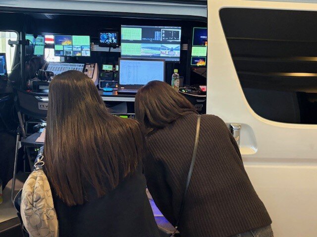 中継車両では、スタンドなどにセッティングされた4台のカメラから映像が送られてくる多数のモニターを見学していただきました。カメラ画面を切り替える「スイッチング」の解説にも耳を傾け、普段見ているスポーツ中継がどのように視聴者の皆さんに届けられているのか、アンバサダーメンバーの皆さんはとても興味深く聞き入っておられました。